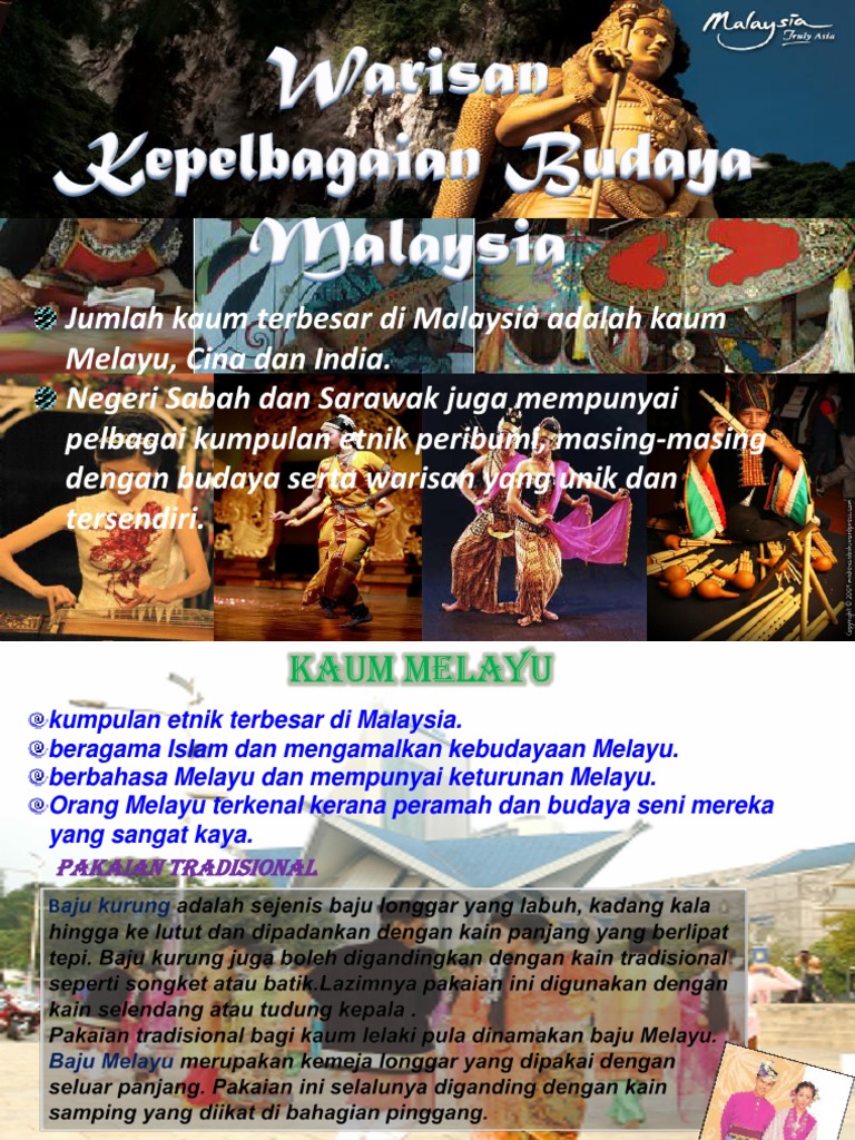 Negara dengan pelbagai budaya. Masyarakat malaysia telah digambarkan sebagai asia dalam miniatur. Jumlah kaum terbesar di malaysia adalah kaummelayu cina dan india negeri sabah dan sarawak juga mempunyaipelbagai kumpulan etnik peribumi masing masingdengan budaya serta warisan yang unik dantersendiri.