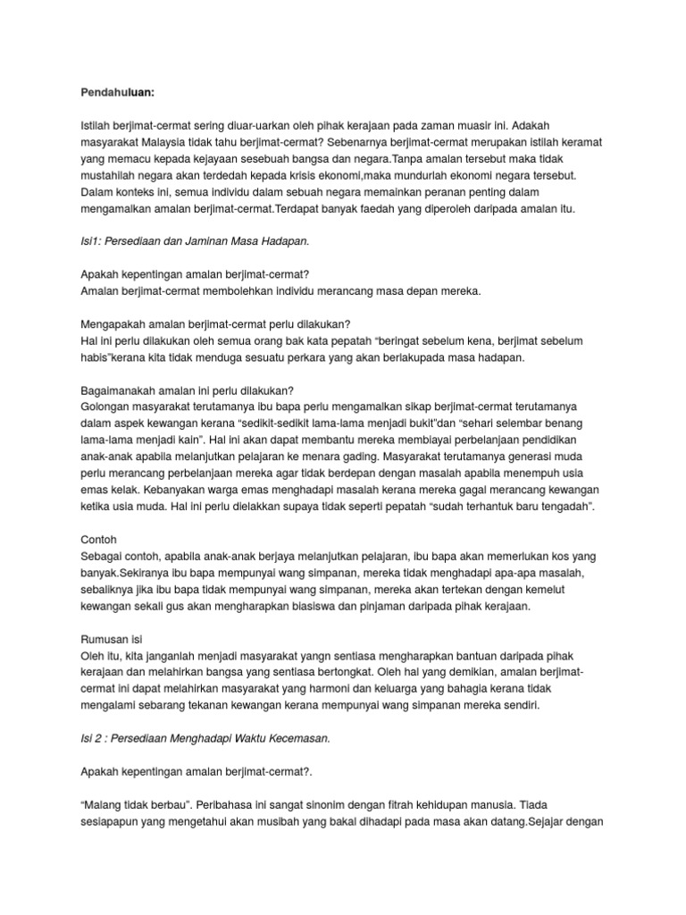 Baginda mengingatkan umatnya supaya sentiasa berjimat cermat khususnya dalam perbelanjaan sehari sehari. Agama islam menentang tabiat dan perbuatan membazir. Karangan kepentingan amalan berjimat cermat dasawarsa ini negara kita telah dilanda oleh gelombang inflasi secara global.