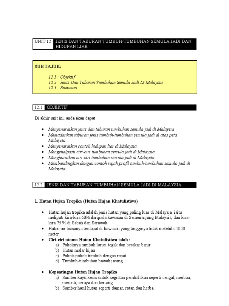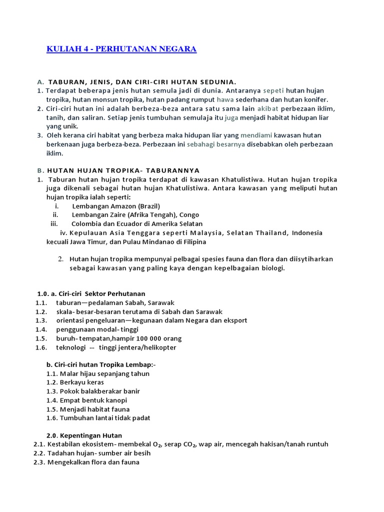Contohnya hutan hujan tropika malaysia mempunyai 14 500 spesis dimana 6 000 spesis berpotensi menjadi sumber perhutanan. Hutan berfungsi sebagai habitat kepada pelbagai hidupan liar miaslnya hutan hujan tropika seluas 0 5 bilion hektar di kawasan amazon mempunyai berjuta spesies haiwan dan 1500 jenis tumbuhan haiwan haiwan ini hidup membesar dan membiak dengan sempurna di dalam kawasan hutan yang ekosistemnya stabil hutan menjadi habitat utama untuk haiwan membentuk linkungan dan meneruskan generasi tumbuhan. Manakala hutan hujan tropika mempunyai pokok pokok yang besar dan tingg yang boleh mencecah ketinggian 45 meter.