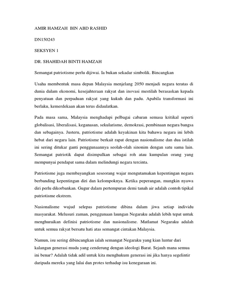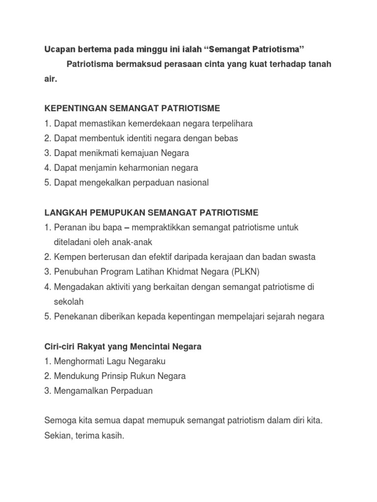 Sesungguhnya semangat patriotisme akan membentuk rakyat yang lebih mementingkan kepentingan negara daripada kepentingan kaum. Nasionalisme dan patriotisme pengertian arti sikap bentuk ciri unsur faktor tujuan akibat manfaat contoh. Menurut abdul rahim 1999 patriotisme akan mencorakkan daya ketahanan dan keiltizaman yang tinggi bagi membolehkan seseorang bertindak dengan berani dan cekal untuk mendaulatkan bangsa dan negara.