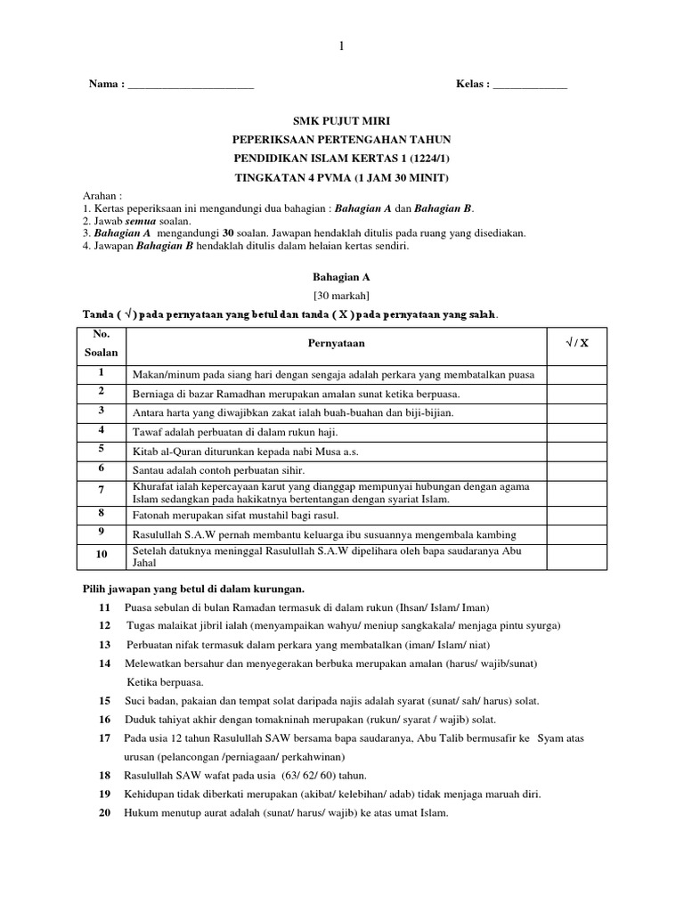 Kertas 1 pendidikan islam tingkatan 4. Nampak ye kertas 1 terbahagi kepada 2. Hitamkan jawapan yang tepat pada kertas jawapan yang disediakan. 1223 1 pp sulit 1223 1 pp pendidikan islam kertas 1 peraturan pemarkahan oktober i 2011 jabatan pelajaran terengganu pi peperiksaan akhir tahun 2011 tingkatan 4 ipl pendidikan islam kertas 1 peraturan pemarkahan untuk kegunaan pemeriksa sahaja amaran peraturan pemarkahan ini sulit dan hak cipta jabatan pelajaran terengganu.