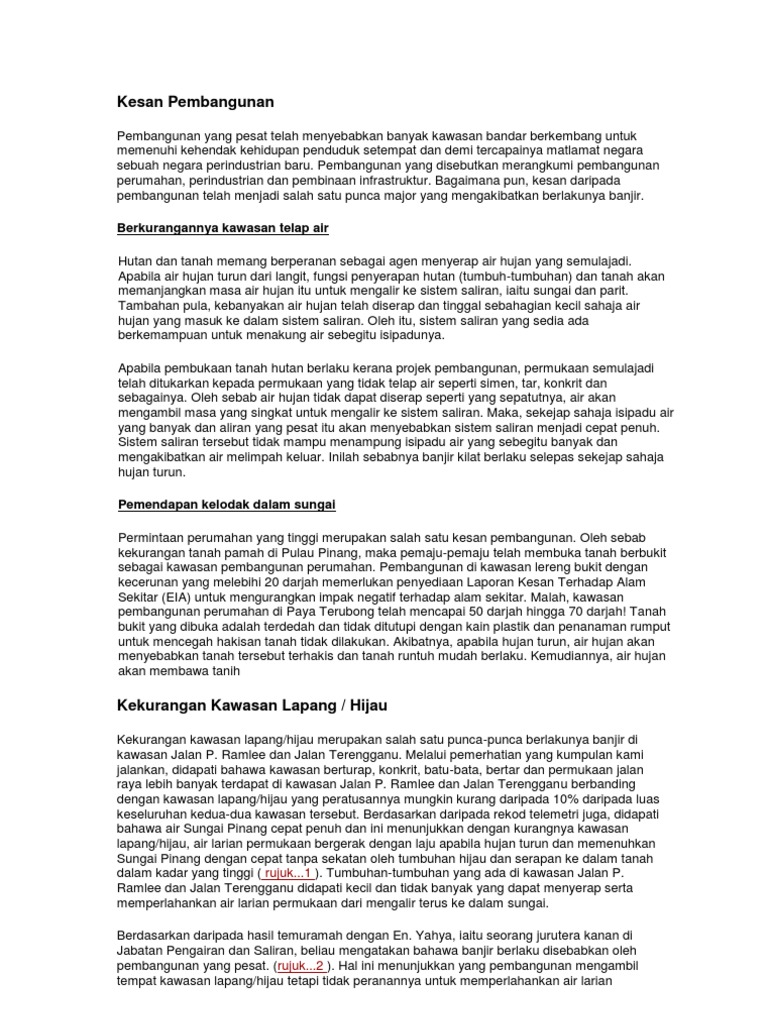 Banjir merupakan bencana yang sering berlaku di negara kita fenomena ini telah menimbulkan pelbagai kesan negatif sama ada kepada masyarakat mahupun negara banjir berlaku disebabkan perbuatan manusia membuang sampah ke dalam parit longkang dan sungai yang menyebabkan aliran air tersekat. Curah hujan yang tinggi akhir akhir ini lantas diiringi oleh datangnya bencana banjir yang menerpa pemukiman penduduk. Antara impak banjir ialah pencemaran hakisan kerosakan pada struktur bangunan kehilangan harta benda kerosakan sistem saliran dan kerencatan aktiviti ekonomi.
