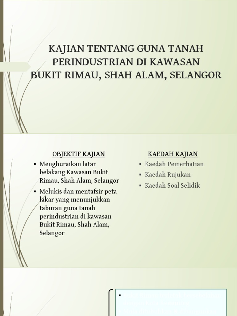Perubahan guna tanah akan memberi kesan negatif yang timbul khususnya terhadap pencemaran alam sekitar seperti masalah pencemaran udara pencemaran air pencemaran bunyi dan sebagainya. Fenomena hujan berasid fenomena ini berlaku apabila jerebu merebak keseluruh tempat. Pencemaran udara berlaku akibat asap yang keluar dari kilang kilang tersebut.