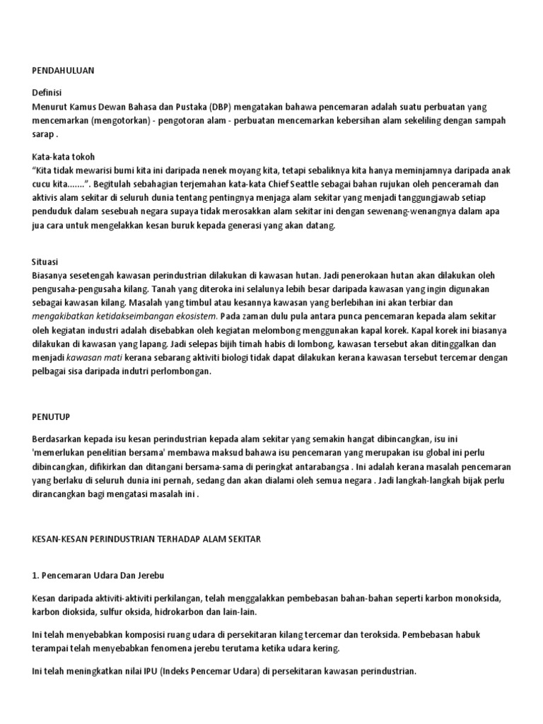 Pelbagai usaha untuk menangani isu isu alam sekitar telah dilakukan sama ada oleh kerajaan pihak swasta dan masyarakat sendiri melalui cara perundangan dan bukan perundangan namun hasilnya tetap tidak memuaskan. Punca penebangan hutan yang tidak terkawal kegiatan pertanian intensif pembuangan sisa toksik perlombongan dilakukan berterusan tanpa kawalan tumpahan minyak di laut kegiatan perikanan menggunakan pukat harimau dan pukat tunda kesan kepupusan flora dan fauna kerana kehilangan habitat dan sumber makanan memusnahkan habitat hidupan akuatik. Bahawa pembangunan kawasan perindustrian akan memberikan kesan positif terhadap sosioekonomi masyarakat setempat.