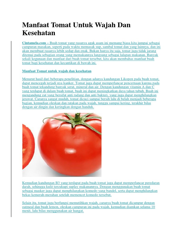 Sapukan pada kulit wajah dan bilas dengan air hangat untuk menyecutkan pori pori yang terbuka. Manfaat tomat tomat adalah tumbuhan yang awalnya ditemukan di negara amerika selatan. Hari ini tomato digunakan secara meluas untuk menghasikan produk kecantikan.
