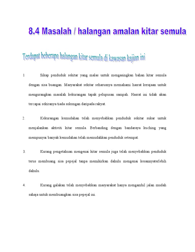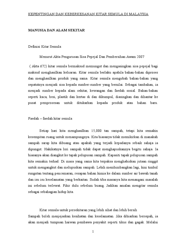 Kitar semula adalah komponen utama bagi pengurusan bahan buangan moden dan kompenon ketiga bagi pengurangan pembaziran guna semula kitar semula atau singkatannya 3r. Setiap hari dianggarkan 37 000 tan metrik sampah dibuang oleh penduduk malaysia dan tahun lalu rm1 2 bilion dibelanjakan bagi kerja pengutipan sampah. Kitar semula adalah penting bagi kita dan alam semula jadi.