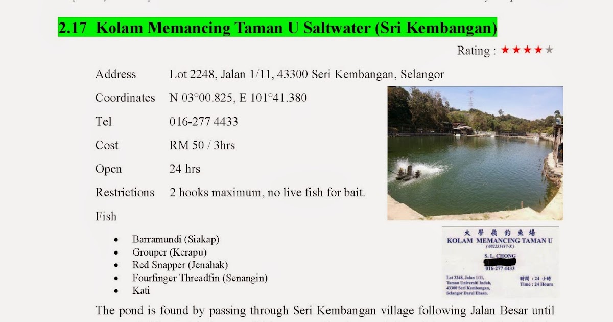 Kolam air tawar fresh water pond rm 20 for 3 jam hours kolam air masin salt water pond rm 40 for. Jenis ikan siakap kaci jenahak g t senangin kerapu naga harimau. Lot 2248 jln 1 11 tmn universiti indah seri kembangan 43300 selangor gps 101 689976 or.